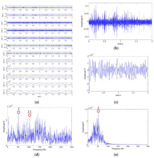 Analysis result of the EMD method; (a) waveforms of top 12 IMFs; (b,d) waveform and spectrum of IMF 1; (c,e) waveform and spectrum of IMF 8.