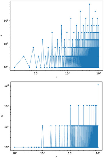 The plot of the dependence for is shown in Figure 2 (top), where n is the number of grains fed to the root. In Figure 2 (bottom), the sequence of a first thousand of avalanches is shown for . The sequence for starts with and it can be constructed according to the same rule as above.