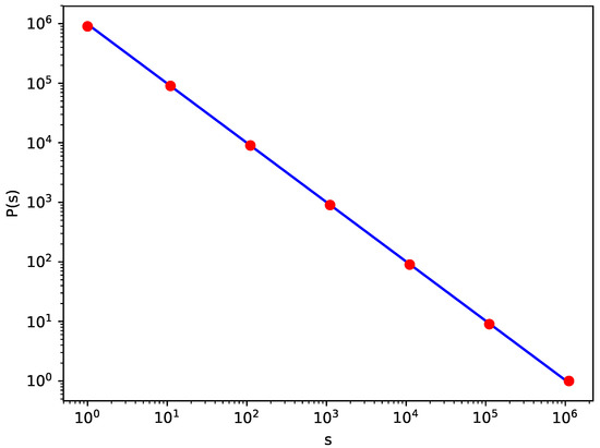 Coming back to the case of unlimited growth, we recall that, for , for the first time, grains should be delivered; next, the whole sequence is repeated times with at the end instead of . By construction, the frequency of events when tends to . In Figure 3, the avalanche size distribution is shown for and , and the log–log plot is nicely linear, with the exponent equal to 1. On the other hand, for , the function can be approximated as , which means that . Consequently, the mean value tends to infinity with the number n of grains.