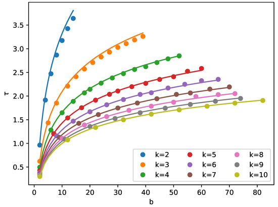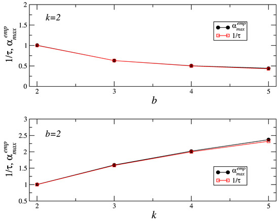 Having this in mind, we repeat our calculation with . Namely, we assume that each node is equipped with a counter, and the signal is released when the number of grains reaches the barrier b. The signal is in the form of grains, and each of k neighbors of the sender at the next level receives one grain, no matter how large the barrier b.
