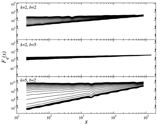In Figure 5, the fluctuation functions estimated for the sequence of avalanches generated by means of the three different lattices are depicted. As is clearly seen in all the cases studied, the functions reveal an almost perfect scaling spanning over four orders of magnitude in scales that provide evidence for a fractal organization of the data. However, the degree of heterogeneity of the scaling exponents depends on the lattice properties and on the barrier level. The broadest span of the scaling exponents of (measured by the slopes of in the log–log scale of Figure 5) is observed for the lattice with and . Here, the scaling exponents at the opposite ends of the q-values are populated densely, however, while those that correspond to the intermediate q-values develop a much larger spread. This reflects multifractality, which, in addition, is strongly non-uniform [25]. In contrast, for a lattice with and , the scaling approaches homogeneity, thus a monofractal organization of the corresponding series. Finally, for a process on the lattice characterized by , the scaling of is spread most evenly.