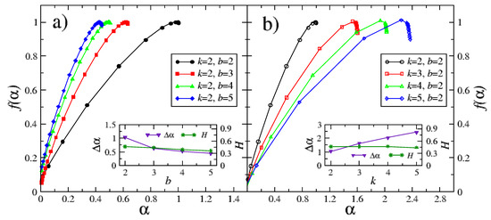 A more systematic sequence of the corresponding characteristics, expressed in terms of the multifractal spectra , is depicted in Figure 6. All spectra are seen to develop a strong left-sided asymmetry (). The impact of the number of links and of the barrier size on its specific shape is different however. The larger the barrier size b, the smaller the width of and thus the more monofractal the organization of avalanches and also the more antipersistent is its behaviour (Figure 6a). The corresponding values of and of the Hurst exponent are shown in the inset of Figure 6a as a function of b. The antipersistent character of the avalanche sequence is related to the fact that each avalanche larger than 1 (1 means avalanche at the first level of the lattice) is preceded and followed by the smaller one, which gives rise to anticorrelation of the entire sequence. Moreover, the larger the number of avalanches at the lattice level n needed to release the avalanche at the level , which is determined by b, the stronger the antipersistence.