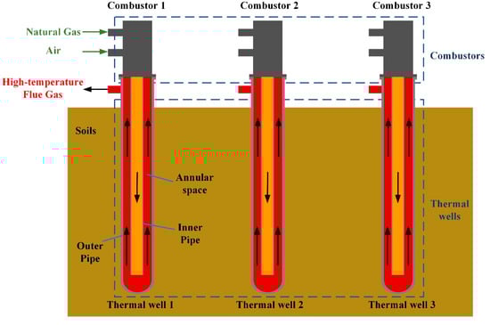 In the process of thermal remediation, the entire treatment zone is heated by an array of natural gas heating devices, as Figure 1 shows. The device is composed of a combustor and a thermal well, and the combustor is fixed on the top of wells. The natural gas and air burn in the combustor. Then, the high-temperature flue gases generated flow into the inner pipe of thermal wells. The gases continue to flow downward to the bottom of thermal wells and enter the annular space. Then, the flue gases flow upward away from thermal wells. In thermal remediation, heat is transferred to the outer wall of thermal well’s outer pipe by convective heat transfer and heat conduction. After that, soil is heated to high temperatures to achieve the removal of pollutants. The objective of this paper is to propose a control strategy to accomplish energy-saving heating of soils by adjusting the natural gas flow and air flow during the heating process.
