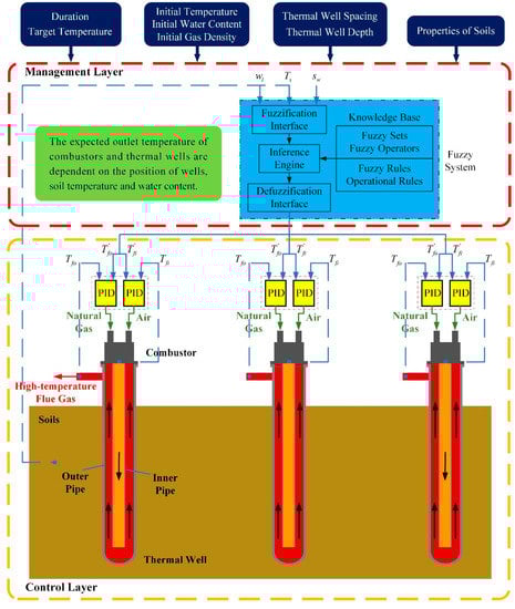Considering the heat leakage to surrounding unheated zones and the moisture migration during the heating process in soils, the requirements of energy at different locations are different. At the same time, the energy demand will be variable when soil temperature changes. On account of these theories, the fuzzy coordination control strategy is proposed. The schematic of control strategy is shown in Figure 2, consisting of a management layer and a control layer.