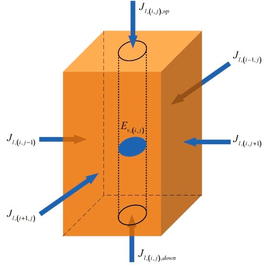 For the mass conservation, the variable quantity of liquid water in a certain unit block is equal to the difference between the amount of migration from the surrounding units and the amount of inside evaporation. As Figure 4 shows, for a single unit block, the mass balance equation of liquid is: