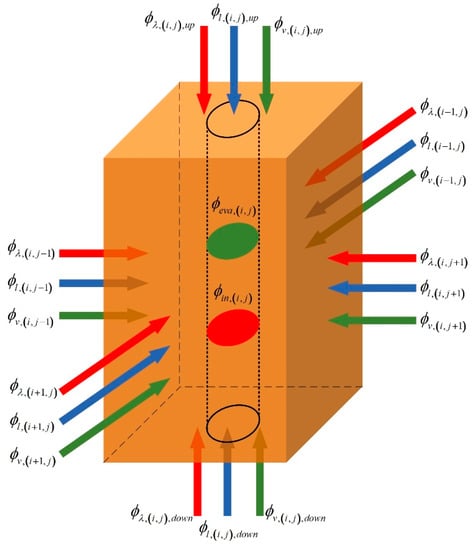 Similarly, for the mass conservation, the variable quantity of vapor in a certain unit block is equal to the sum between the amount of migration from surrounding units and the amount of internal evaporation. For a single unit block, the mass balance equation of vapor is: