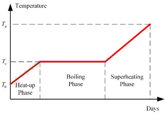 During the heating process of thermal remediation, soil temperature can rise up to a very high value (generally around 350 °C []). A large number of experimental studies have shown that the temperature history of soils consists of three phases: heat-up phase, boiling phase, and superheating phase [], as shown in Figure 6.