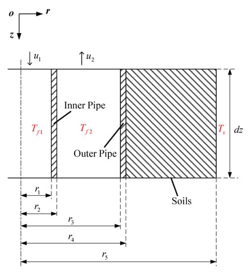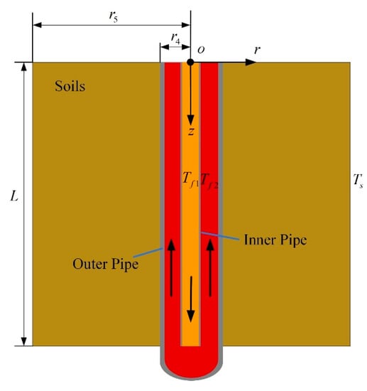 In order to obtain the heating power of thermal wells, the model of wells is established. Figure 7 shows the structure of thermal wells, which is composed of an inner pipe and an outer pipe, and an annular space is formed between inner pipe and outer pipe. High-temperature flue gases generated by combustors flow in through the inner pipe and then flow out through the outer pipe, thereby heating soils. In order to simplify the analytical process, it is assumed that the heat transfer in the thermal well is quasi-steady. Further, the heat transfer of the fluid in axial direction is ignored, and the heat transfer in the thermal well is considered to be one-dimensional in the radial direction. It is supposed that heat transfer of fluid in radial direction is converted into the temperature variation along the axial direction. Thus, the temperature relations of flue gases in the inner pipe and the annular space along axial direction are respectively established, and an analytical solution of the thermal well’s outlet temperature is obtained. The coordinates are set as shown in Figure 7. The origin of coordinates is located at the intersection of the axis of thermal wells and the ground surface.