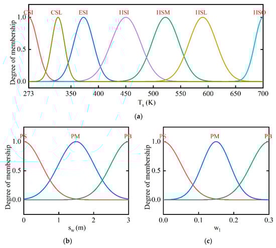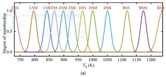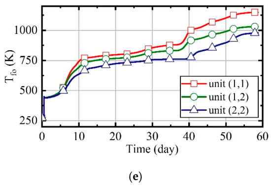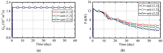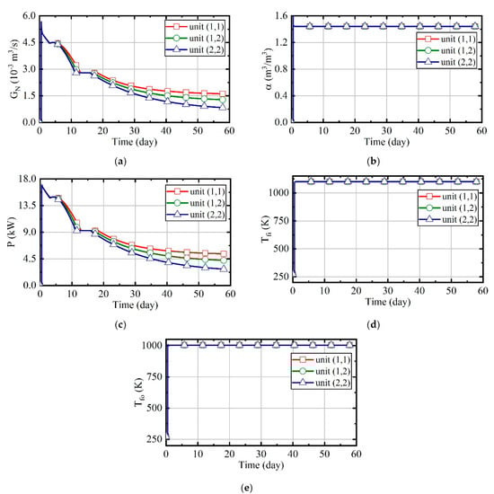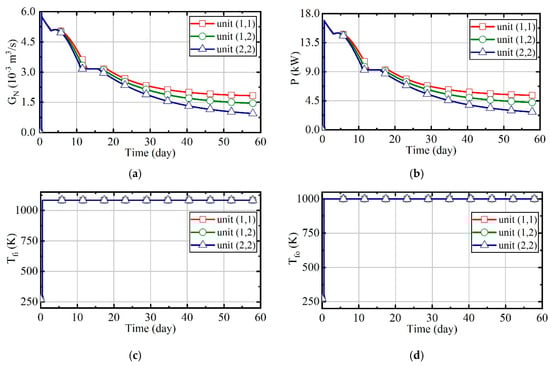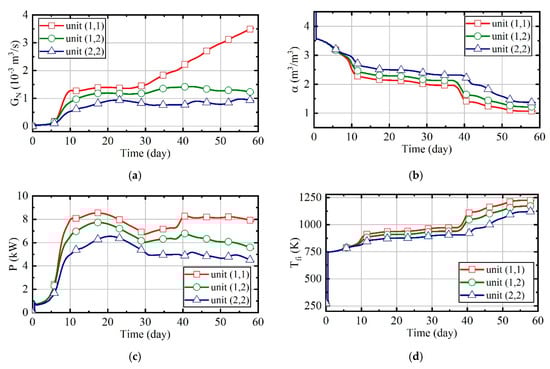Figure 25 represents the variation of natural gas flow, excess air ratio, heating power, and outlet temperature of combustors and thermal wells over time for units (1,1), (1,2), and (2,2). From Figure 25d,e, it can be observed that the outlet temperatures of combustors and thermal wells increase gradually with time after the adjustment of fuzzy system, and the closer the distance is to the boundary, the larger the values are. Therefore, the set values of unit (1,1) are largest among three units. The natural gas flow increases over time, and the excess air ratio reduces over time, as Figure 25a,b shows. From Figure 25c, it can be seen that the heating power keeps a small fluctuation. Since unit (1,1) has the largest amount of heat dissipation, its heating power is the highest.