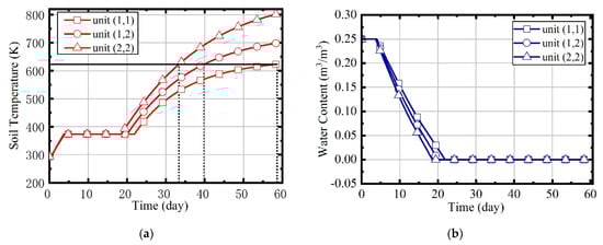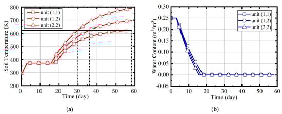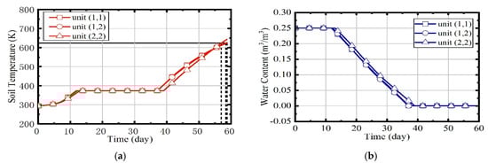 In case 4, the heating process of soils is controlled by the fuzzy coordination control strategy. The desired outlet temperature of combustors and thermal wells are adjusted by the fuzzy system. Figure 24 illustrates the variation of soil temperature and water content in case 4. It can be seen that the difference among three units’ temperature rise curves is very little after the adjustment of fuzzy system, and the three units reach the target temperature almost simultaneously. The durations of units (1,1), (1,2), and (2,2) are 58.75, 58.37, and 56.94 d.