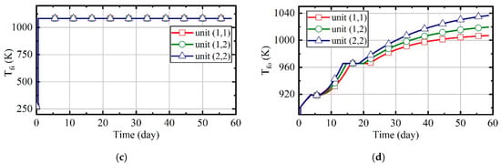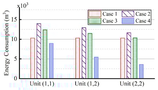 Figure 28 represents the energy consumption of each unit in four cases. Compared to that in case 1, the energy consumption of units (1,1), (1,2), and (2,2) in case 4 reduced by 13.2%, 46.9%, and 65.0%, separately. Further, among the three units, the degree of reduction in unit (2,2) is the highest. This is because in cases 1, 2, and 3, the difference in temperature rise of different units is large, and unit (2,2) will reach the target temperature as soon as possible. However, the entire site has not reached the target temperature, and the unit is still heated, so that its temperature will continue to rise, close to 800 K. Further, because of the large temperature difference among units, a considerable part of the energy will be transmitted to other units from unit (2,2), so the energy consumption is relatively high. In case 4, the temperature difference among different units is small, and the durations of different units are not much different, with less heat removed from unit (2,2). Therefore, the reduction proportion of unit (2,2) is the largest, and that of unit (1,1) is the littlest.