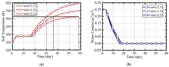 (a) The variation of soil temperatures in case 4; (b) the variation of water contents in case 4.