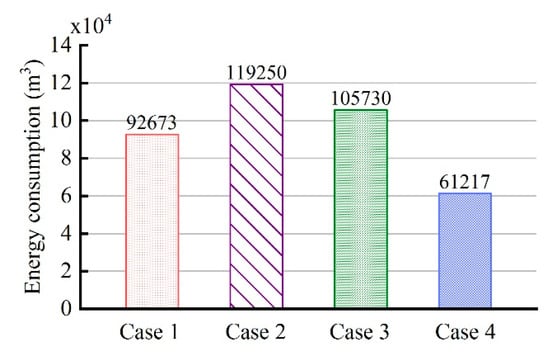 After the simulation analysis of four cases, the energy consumption of different cases can be compared and analyzed to verify the superiority of the proposed control strategy for reducing energy consumption. Figure 27 illustrates the total energy consumption of the entire treatment zones in the four cases. It can be seen that the energy consumption of case 2 is the highest, 119,250 m3, and the energy consumption of case 4 is the lowest, 61,217 m3. Compared to that of case 1, the total energy consumption of cases 2 and 3 increased by 28.7% and 14.1%, respectively, while that of case 4 decreased by 33.9%. Meanwhile, the durations of the four cases are not much different, all being around 58 days. According to research, the control method of case 2 is commonly used by some companies, and compared to this method, the energy consumption of case 4 can be decreased by 48.7%. Therefore, the fuzzy coordination control strategy proposed in this paper can greatly reduce energy consumption without changing the total duration and achieve the energy-saving heating of soils.