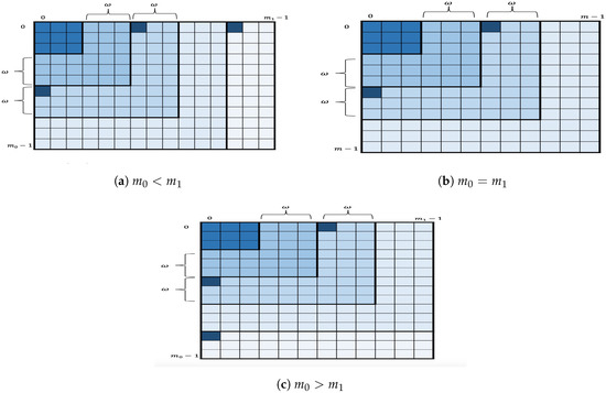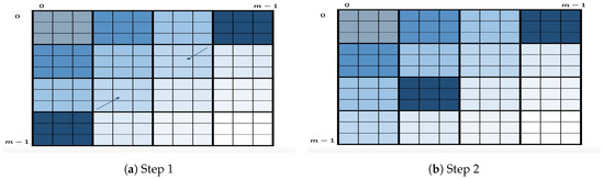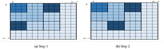 To handle this, each is partitioned into squares of size . The algorithm still enumerates the key candidates in first, then in , and so on, but in each , the enumeration will be square-by-square. Figure 3 depicts the geometric representation of the key enumeration within where a square (strong shade of blue) within a layer represents the square being processed by the enumeration algorithm. More specifically, for given nonnegative integers I and let us define as