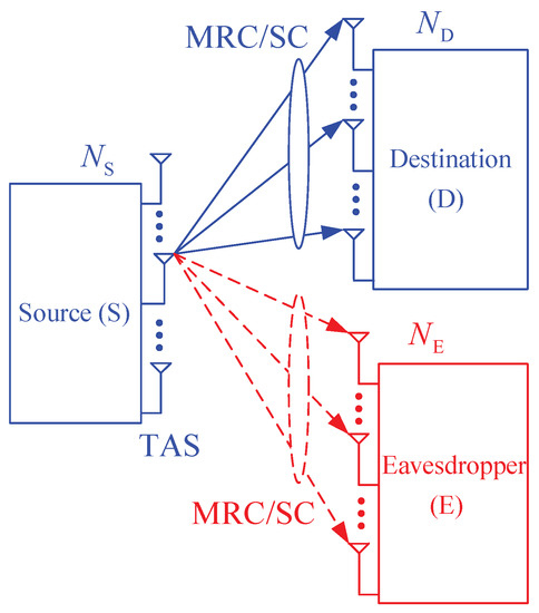 Secure communication is one of the critical issues of wireless communication systems due to the broadcast nature of wireless channels. Conventionally, cryptographic methods at upper layers are used to obtain wireless security via generating cryptographic keys. However, eavesdroppers can decode the encrypted signals if they are equipped with advanced equipment and have enough time for the decoding operation. In [1,2,3,4,5,6], the authors introduced a new security method, called physical-layer security (PLS), where characteristics of wireless channels, i.e., distances and channel state information (CSI), can be exploited to ensure confidentiality of the data transmission. To obtain the security in PLS, the secrecy capacity must be greater than zero or the channel capacity of the data link must be better than that of the eavesdropping link. For example, joint transmit and receive diversity methods [7,8,9,10] were proposed to enhance secrecy performances for multiple-input-multiple-output (MIMO) secure communication protocols, in terms of secrecy outage probability (SOP) and probability of non-zero secrecy capacity (PNSC). Particularly, the transmitters in [7,8,9,10] select the best transmit antenna (transmit antenna selection (TAS)) to maximize post-processed signal-to-noise ratios (SNRs) obtained at the intended receivers that use maximal ratio combining (MRC) or selection combining (SC). Because the eavesdroppers in [7,8,9,10] only obtain the receive diversity with their MRC or SC combiners, the diversity order of the data links can be higher than that of the eavesdropping ones. In [11], the secrecy outage performance of the TAS/MRC method in underlay cognitive radio networks (CRNs) was evaluated. In the underlay spectrum sharing approach, transmit power of the secondary transmitters is limited by a pre-determined interference level so that quality of service (QoS) of the primary network is not harmful. In contrast to [11], the authors in [12] proposed a secure transmission protocol in overlay CRNs. In this system model, a full-duplex secondary transmitter employs TAS/MRC to transmit the secondary data and receive the primary data at the same time. Moreover, it can use an interactive zero forcing beam-forming method to simultaneously broadcast both the primary and secondary data. The protocol proposed in [12] not only enhances the SOP performance for the primary network but also improves throughput of the secondary transmission. Published works [13,14] introduced the PLS schemes in radio frequency energy harvesting (RF-EH) environment. In [13], one multi-antenna base station adopts TAS to send information and energy to one desired receiver and EH receivers, respectively. Since the EH receivers can illegally decode the information of the intended receiver, there exists a trade-off between energy harvested and security of the data transmission. In [14], an energy-limited source harvests the RF energy from a dedicated power beacon for transmitting the data in presence of multiple eavesdroppers. In addition, the source can employ TAS or maximal ratio transmission (MRT) to enhance the secrecy diversity order. Recently, secure transmission approaches for non-orthogonal multiple access (NOMA) systems have been studied. In contrast to conditional transmission techniques, the source using NOMA can send multiple signals to the destinations at the same time, frequency and code. Indeed, the signals that are linearly combined with different transmit power levels are then sent to the destinations which use successive interference cancellation (SIC) to extract the desired signals. In [15], the authors proposed various TAS methods to enhance the secrecy performance for two-user down-link NOMA networks. Reference [16] investigated the SOP performance of a secure NOMA system using max-min TAS method, in presence of non-colluding and colluding eavesdroppers.