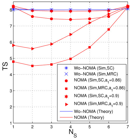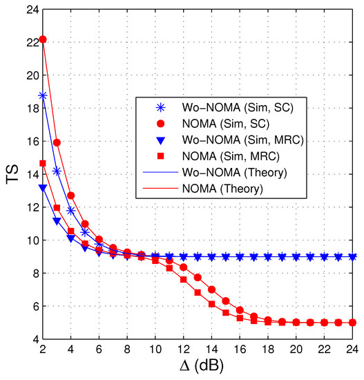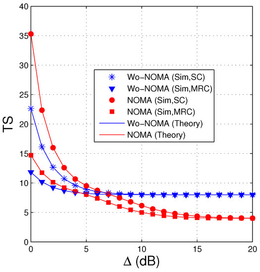 Figure 3 shows similar results to Figure 2, i.e., the performance of the NOMA protocol is better than that of the Wo-NOMA protocol at medium and high transmit SNRs. We also see from Figure 3 that the TS values of Wo-NOMA and NOMA at high regimes converge to and , respectively. In addition, as shown in Figure 2 and Figure 3, the TS performance of Wo-NOMA more rapidly converges than that of NOMA. Again, the simulation results validate the correction of the theoretical ones.