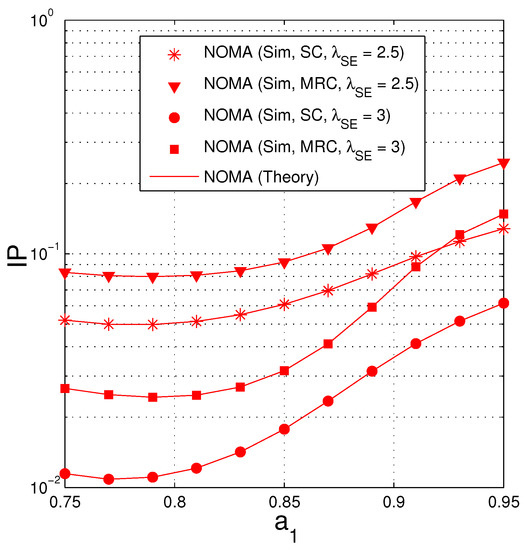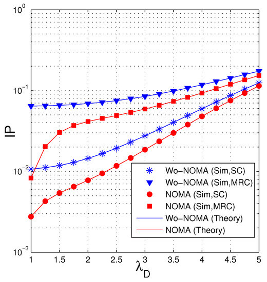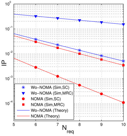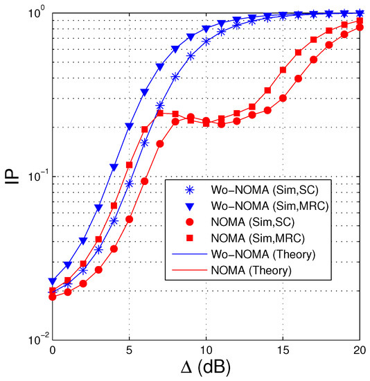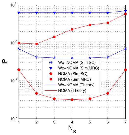 Equations (50) and (55) exactly express the IP performance of the Wo-NOMA and NOMA protocols. To obtain the IP values, we truncate the infinite series by 500 first terms. Moreover, because (50) and (55) are in closed-form formulas, which can be used efficiently in designing and optimizing the networks.