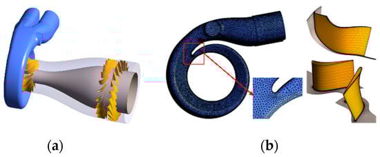 The computational fluid dynamics commercial software ANSYS CFX was applied to solve the unsteady flows in the two-stage turbine. The meshes of the volute, rotors and stator are shown in Figure 2b. The quality of the mesh has important effects on the accuracy of the simulation []. In this paper, the unstructured grid in the HPT volute was created by using the module MESHING in ANSYS. The mesh quality of HPT volute is shown in Table 3. The structured grids in the rotors and stator passage were created in the module TURBOGRID. High quality of structured grids was obtained with the method, as shown in Table 4. Finally, the four calculation domains were assembled in CFX-PRE. There were a total of 2.03 million grid elements in the calculation activities, with 1.1 million in volute, 0.24 million in HPT rotor, 0.33 million in LPT stator and 0.36 million in LPT rotor.