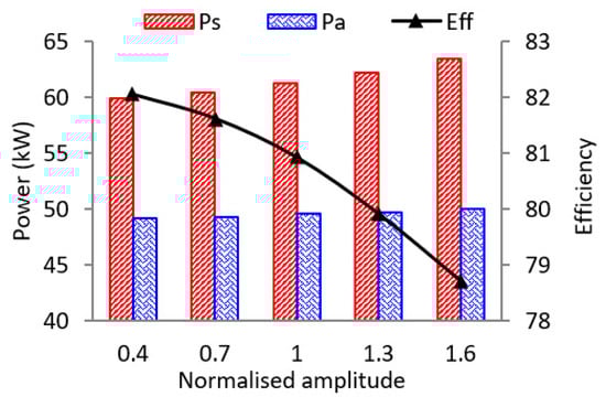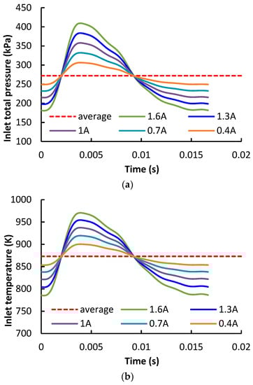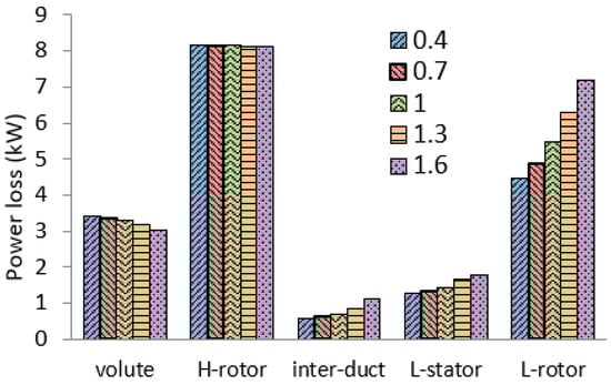 The impacts of the pulse amplitude on the cycle-averaged power loss in each component are shown in Figure 10. As the pulse amplitude increases, the power losses in volute and HPT rotor decrease slightly. It is an interesting phenomenon and seems to be unresonable. Actually, the pulse amplitude will affect the power split between the HPT and LPT, which was reported in a previous study []. As the pulse amplitude increases, more power will be distributed to the LPT. Therefore, the power split to the HPT will be less. As a result, the power loss will become less. However, the HPT efficiency will still decrease. In contrast, the power losses in the LPT components increase significantly as the pulse amplitude increases. Especially in LHT rotor, the power loss increases by 60% when the pulse amplitude increases from 0.4 A to 1.6 A.