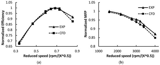 The CFD model can well predict the turbine performance under steady and pulsating flow conditions. Since it is difficult to operate the two-stage turbine experiment due to the test bench limitation, the prediction accuracies of the two turbines’ performances are validated separately. Figure 4 presents the comparisons of HPT efficiency and mass flow parameters between the experimental data and CFD results. The definition of blade speed ratio (BSR), mass flow parameter (MFP) and turbine reduced speed are given in Equations (2), (3) and (4), respectively. The normalized efficiency is the ratios of the current efficiency to the peak efficiency in the experiment. The normalized MFP is the ratios of the MFP to the largest MFP in the experiment. BSR is the ratio between the rotor tip velocity and gas spouting velocity. The latter one is related to the turbine inlet total temperature and expansion ratio. For radial-inflow turbine, the optimum BSR is approximately 0.7. As BSR deviates from the optimum value, the turbine isentropic efficiency drops [].