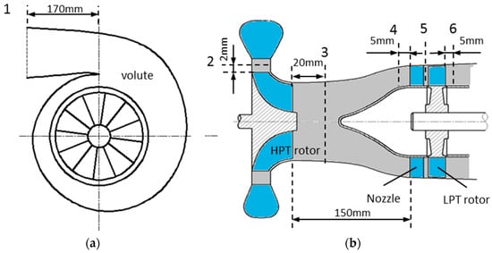 The main geometry parameters of the two-stage turbine are given in Table 1 and Table 2, respectively. The HPT rotor had 12 blades and the LPT had 19 vanes and 20 blades. The diameters of the HPT and LPT rotors were 84 mm and 132 mm, respectively. Both of the rotor tip gaps were 0.5 mm.