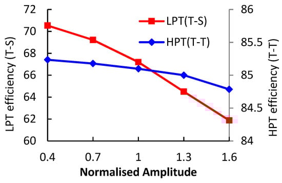 The impacts of pulse amplitude on turbine average isentropic efficiency.
