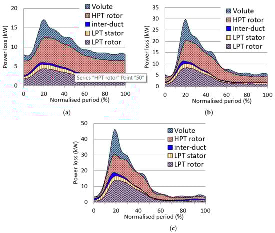The power losses in each component as a function of time are shown in Figure 9. The peak of the loss appears at 20% of the pulse period, corresponding to the peak pressure. It should be noticed that the peak losses in the LPT components actually appears at approximately 28% of the pulse period due to phase lag. The current figure has been manipulated to make them in phase. As shown in Figure 9a, the power losses mainly occur in the HPT rotor and LPT rotor. The power losses are significant in the whole pulse period. The loss in volute is also significant. In contrast, the losses in inter-duct and LPT stator are nearly neglected.