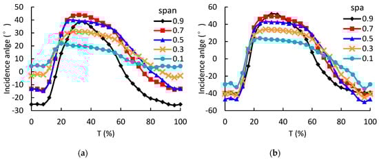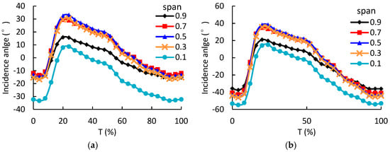 The circumferential-averaged incidence angle at different span of the LPT rotor as a function of time; (a) LPT rotor with 1.0 A pulse amplitude; (b) LPT rotor with 1.6 A pulse amplitude.