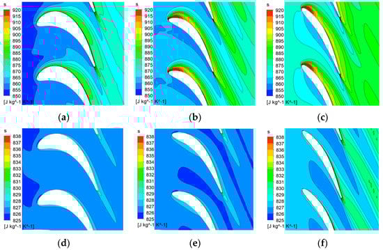 The entropy contour at 20%, 50% and 80% span of the LPT rotor at different times when the pulse amplitude is 1.6 A; (a)peak time, 20% span; (b)peak time, 50% span; (c)peak time, 80% span; (d)100% T, 20% span; (e)100% T, 50% span; (f)100% T, 80% span.