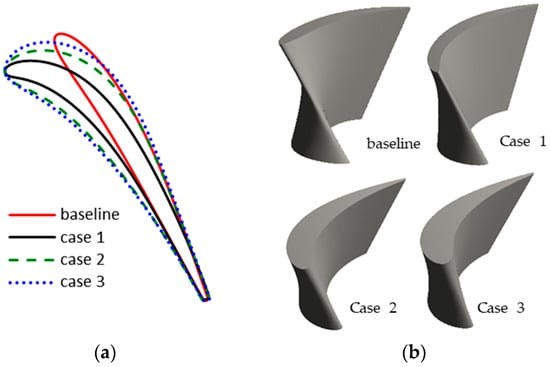 From the above analysis, the large variation of inlet incidence angle near the blade tip leads to significant flow loss under pulsating flow conditions. To alleviate the flow separation near the tip region, it is necessary to adjust the inlet blade angle distribution. Since the most exhaust energy is contained at the peak during a pulse period, the rotor blade angle should be redesigned to extract more energy at peak. In addition, blades with different thickness are designed in order to explore its impacts on the unsteady turbine performance. Thus, three different blade shapes at tip are designed, as shown in Figure 14, in comparison with the baseline blade tip.