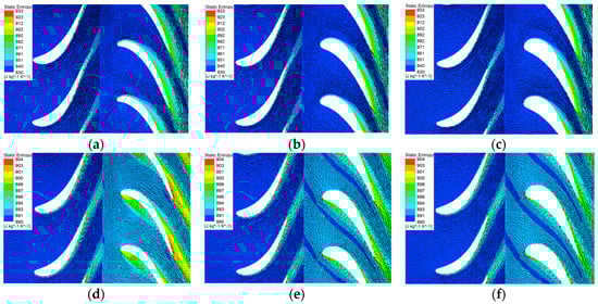 At 100% pulse period, the entropy near rotor tip is also larger than near hub. As shown in Figure 13d–f, high entropy values appear at the leading edge of the pressure side due to negative incidence angle. Since the velocity at 100% T is much lower, the entropy loss is significantly lower than that at peak time condition. However, it can still be observed that the entropy loss near tip is a lot larger than that near hub.