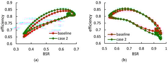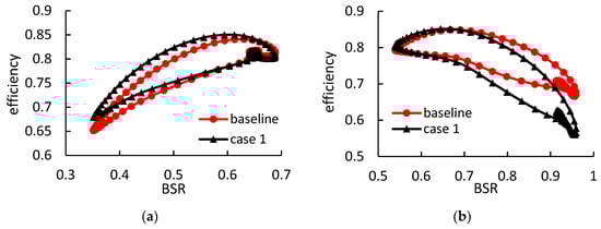 It is shown that the rotor efficiency in case 1 is remarkably improved under low BSR conditions. The maximum improvement of the instantaneous efficiency is up to 3%. However, the rotor efficiency in case 1 decreases rapidly as the BSR increases. The maximum reduction of the instantaneous efficiency is up to 10.5% when the BSR is approximately 0.96. Therefore, it can hardly both improve the performances under high- and low-load conditions by merely adjusting the inlet blade angle. Although the rotor efficiency improves greatly under high-load condition, the performance under low-load condition deteriorates significantly.