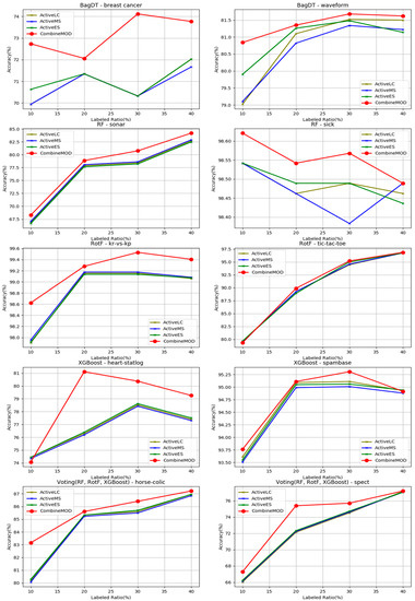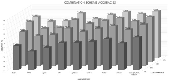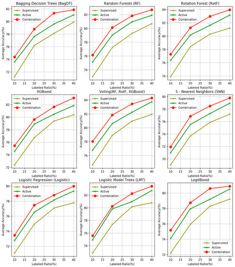 - The proposed combination method outperforms all other four learning methods in all four labeled ratios and for all the nine base learners used as control methods, in terms of average accuracy. This argument is also validated in Figure 3, where the comparisons are visually assembled and a progressive picture of the performance of the two dominant methods is presented as the R increases. The SL method was also included as a baseline performance metric.