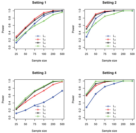 Empirical statistical power of four different measures including (blue), (red), (black) and (green), under settings 1–4. In each setting, sample sizes are , and all results were based on 1000 replications.