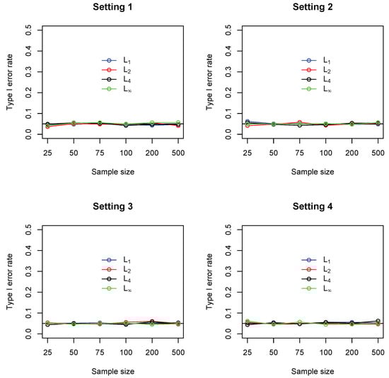 Empirical Type I error rate of four different measures including (blue), (red), (black) and (green), under settings 1–4. In each setting, sample sizes are , and all results were based on 1000 replications.