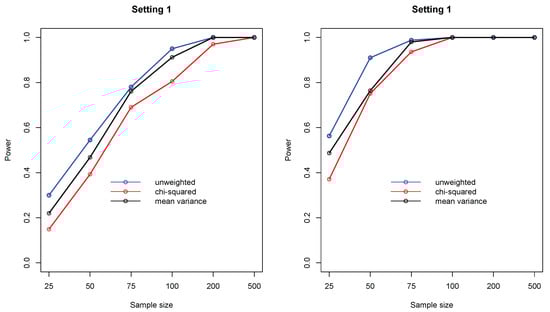 In the second simulation study, I focused on as it subsumes many popular measures. In particular, I compared three different weight functions, including (distance covariance), (Pearson’s chi-squared), and (modified mean variance index). Figure 3 shows the empirical statistical power of the three measures under settings 1 and 2, where it can be seen that the unweighted compares favorably to the weighted ones.