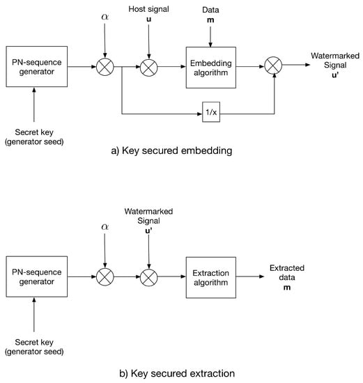 For extraction, the same PN-sequence is generated using the secret key and added to the received watermarked signal; then, the extraction algorithm is applied. This additive strategy sets a symmetric-key scenario.