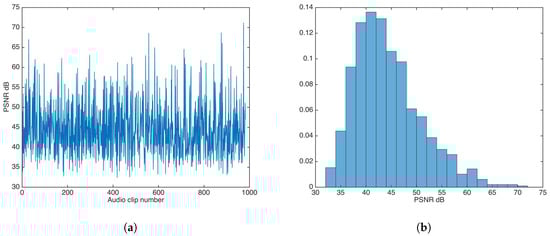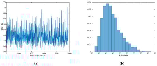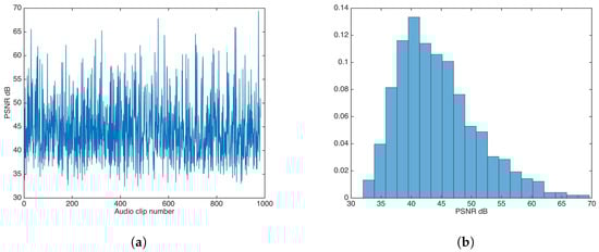 The whole audio dataset [] was fed to the watermark insertion process without any key-based security strategy. Figure 5 shows the PSNR results and PSNR distribution in this experiment.