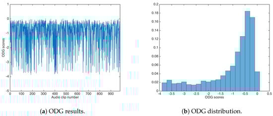 ODG evaluation was carried out in similar way for the audio dataset. Figure 6 shows the ODG results and the ODG distribution in this experiment.