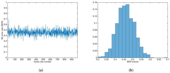 Using the additive strategy, the whole audio set was watermarked utilizing a key, . Then, data was extracted utilizing a key with . As detailed above, the value was set to .