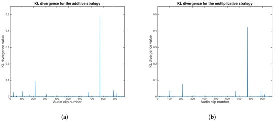 where is the distribution of C, is the distribution of S, and is an arbitrary low number. If , the steganographic system is a “perfectly secure” case. However, very low values are enough for steganographic systems for real-world signals. Figure 13 shows KL divergence results for both the additive and multiplicative strategies.