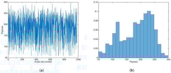 The payload mean, median, and variance were calculated as , 195, and , respectively; the minimum and maximum payload values were 59 and 298, respectively, for 5-s audio clips.