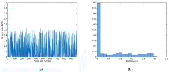 BER results after Advanced Audio Coding (AAC) compression at 256 kbps. (a) BER results. (b) BER distribution.