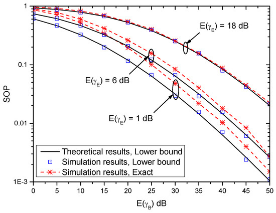 Figure 3 shows the SOP versus E ( γ B ) with different E ( γ E ) when γ th = 0 dB and ( α B , β B ) = ( α E , β E ) = ( 2 , 2 ) . It can be observed that the SOP performance improves with the increase of E ( γ B ) . This indicates that the larger the average strength of the main channel is, the better the system performance becomes. Moreover, the theoretical results of the lower bound of SOP match the simulation results very well. This shows the accuracy of the lower bound of SOP. Furthermore, when E ( γ E ) = 1 dB, which does not satisfy the condition E ( γ E ) 1 , and thus the performance gap between the lower bound of SOP and the exact result of the SOP is observable. With the increase of E ( γ E ) , the gap becomes smaller and smaller. This indicates that when E ( γ E ) 1 , the derived lower bound of SOP can be used to evaluate the system performance, without reliable on time-intensive simulations.