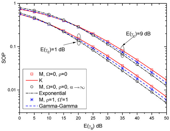 In this subsection, the lower bounds of the SOP over different fading channels are also provided, as shown in Figure 5. In this figure, the lower bounds of the SOP over the K, exponential, and Gamma-Gamma fading channels are derived in (36), (40) and (44), respectively. Moreover, the lower bounds of the SOP over the M-distributed fading channel (i.e., (16)) with special parameters are also provided. As can be seen in Table 1, when Ω = 0 and ρ = 0 , the M-distributed channel reduces to the K channel; when Ω = 0 , ρ = 0 and α , the M-distributed channel reduces to the exponential channel; when ρ = 1 and Ω = 1 , the M-distributed channel reduces to the Gamma-Gamma channel. As can be observed, the results of (16) with Ω = 0 and ρ = 0 match with that of (36) very well. The results of (16) with Ω = 0 , ρ = 0 and α and the results of (40) coincide with each other. Similarly, the difference between (16) with ρ = 1 and Ω = 1 and (44) is so small and it can be ignored. These conclusions indicate that the derived expression of SOP over the M-distributed fading channel is a general expression, which can be accurately extended to other well-known fading channels.