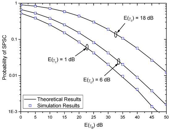 Figure 6 shows the probability of SPSC versus E ( γ B ) with different E ( γ E ) when ( α B , β B ) = ( α E , β E ) = ( 2 , 2 ) . In this figure, the value of SPSC decreases with the increase of E ( γ B ) . However, the value of the probability of SPSC increases with the increase of E ( γ E ) . This shows the impacts of the average strength of the main channel and the average strength of the main channel on system performance. Moreover, it can be seen that the theoretical results match the simulation results very well, and thus the derived exact expression of the probability of the SPSC is very accurate to evaluate the system performance.
