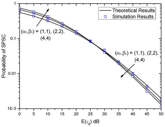 Figure 7 shows the probability of SPSC versus E ( γ B ) with different ( α E , β E ) when ( α B , β B ) = ( 2 , 2 ) . Obviously, with the increase of E ( γ B ) , the probability of SPSC decreases. The conclusion is the same as that in Figure 6. Once again, it can be observed that small differences appear between the theoretical results and the simulation results. Therefore, the exact expression of the probability of SPSC can be used to evaluate the system performance without time-intensive simulations. Moreover, it can be seen that when E ( γ B ) is small, the probability of SPSC increases with the increase of ( α E , β E ) . However, the trends of curves changes when E ( γ B ) is large, i.e., the probability of SPSC decreases with the increase of ( α E , β E ) .