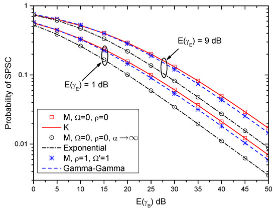 In Figure 8, the probabilities of the SPSC over different fading channels are also provided. Specifically, the probabilities of the SPSC over the K, exponential, and Gamma-Gamma fading channels are obtained by (37), (41) and (45), respectively. Moreover, the probability of the SPSC over the M-distributed fading channel (i.e., (20)) with special parameters are also provided as shown in Table 1. Similar to Figure 5, the results over the M-distributed fading channel with special parameters match the results of the other fading channels very well. Therefore, the derived probability of SPSC over the M-distributed fading channel can be used as a unified expression for many well-known fading channels.