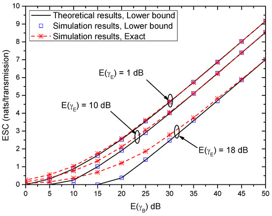 Figure 10 shows the ESC versus E ( γ B ) with different ( α E , β E ) when ( α B , β B ) = ( 2 , 2 ) . As seen in Figure 9, the ESC also increases with the increase of E ( γ B ) in Figure 10. Moreover, the gaps among the theoretical results of the lower bound of ESC, the simulation results of the lower bound of ESC and the exact results of ESC are very small for large E ( U ) . This conclusion is the same as that in Figure 9. Furthermore, with the increase of ( α E , β E ) , the ESC performance degrades.