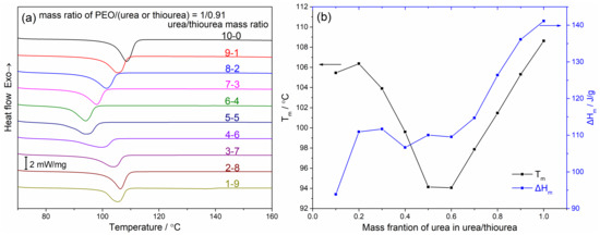 (a) Differential scanning calometry heating curves of the PEO/urea/thiourea IC samples with various urea/thiourea mass ratios prepared by the isothermal crystallization at 70 °C from the PEO/urea/thiourea mixed melt. (b) The melting points and the enthalpies of fusion of the same samples obtained from the DSC curves.